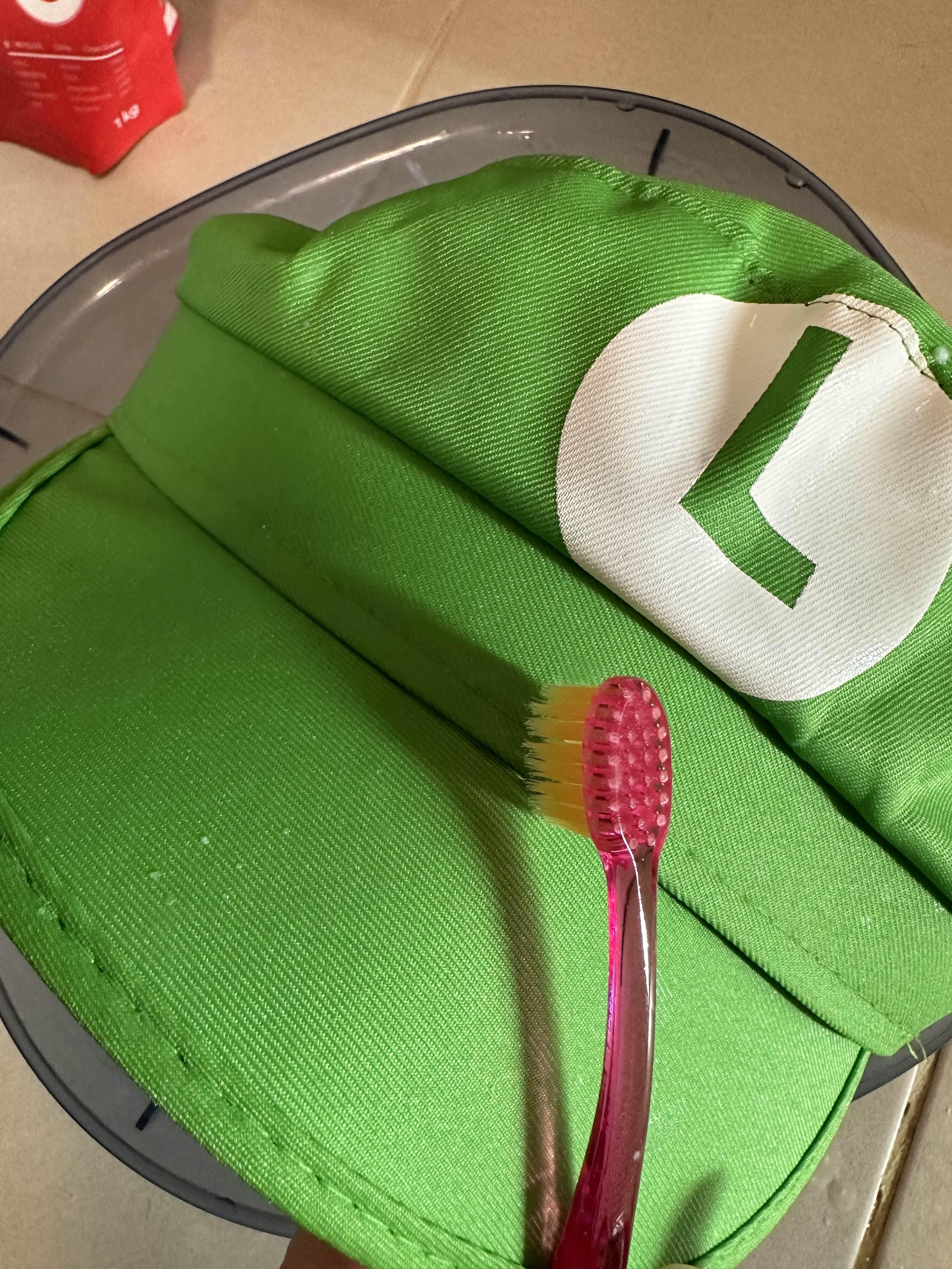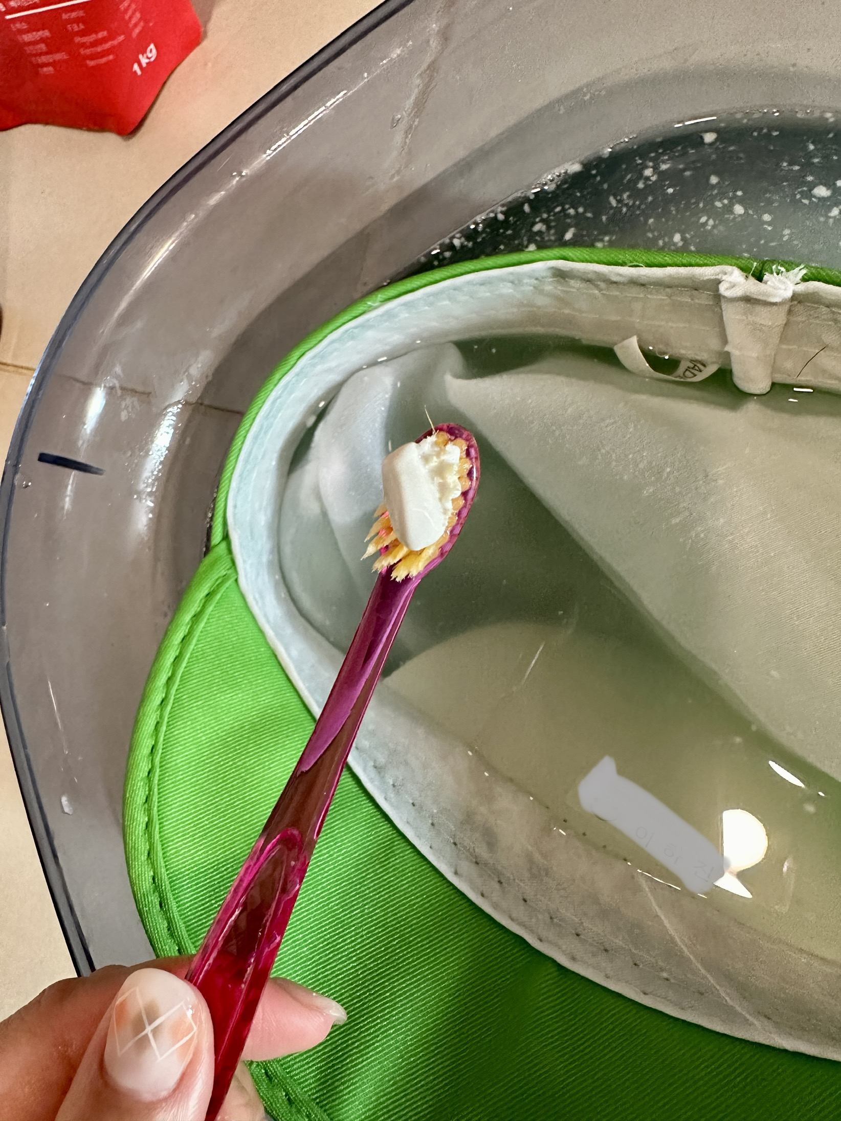 얼룩진 모자를 30분 정도 푹 담궈 놨다가,
