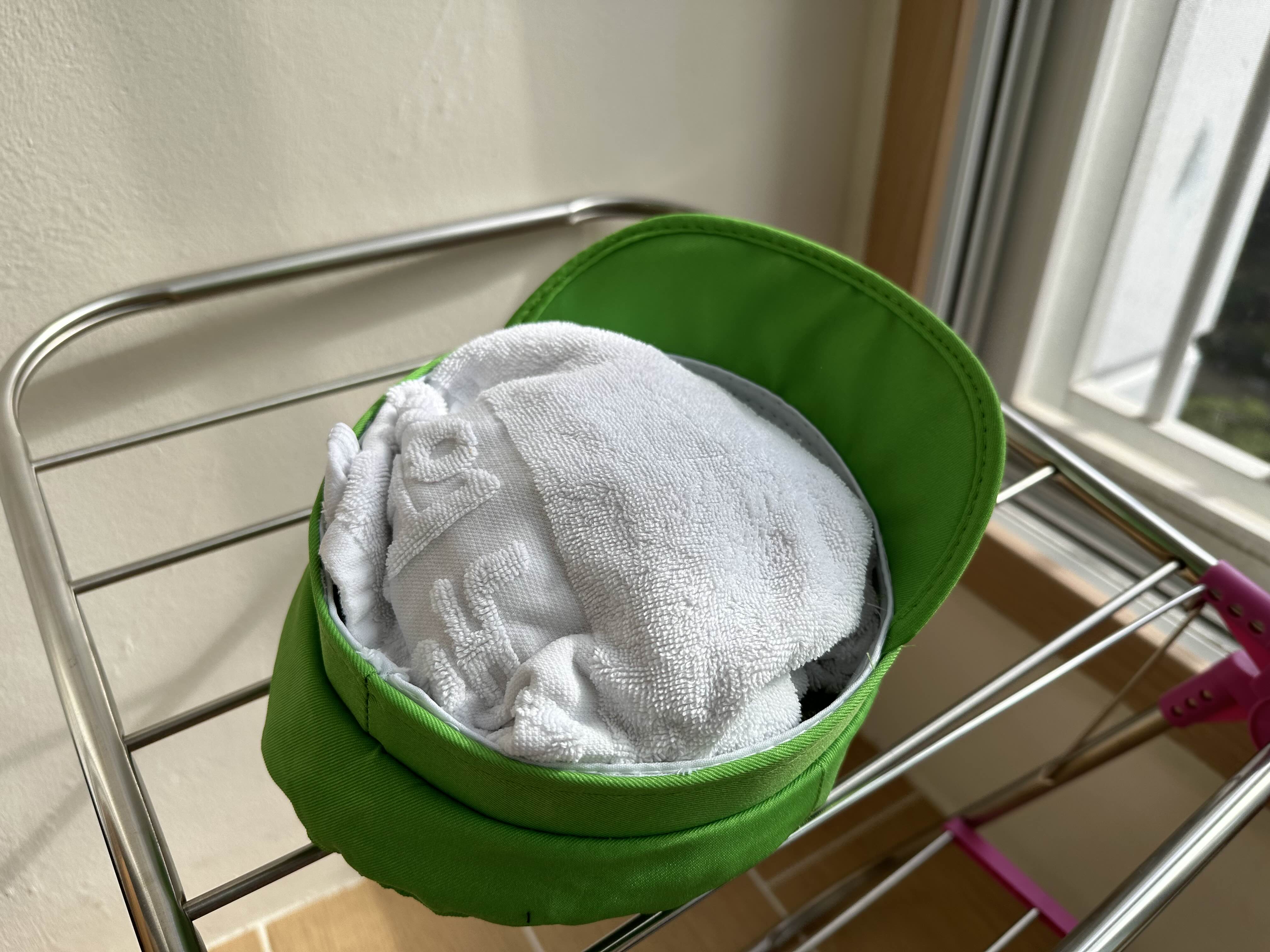 그리고 마른 수건을 모자에 넣어서 모자가 모양이 잡히게 한 다음 응달에서 하루정도 말려주면 된다.