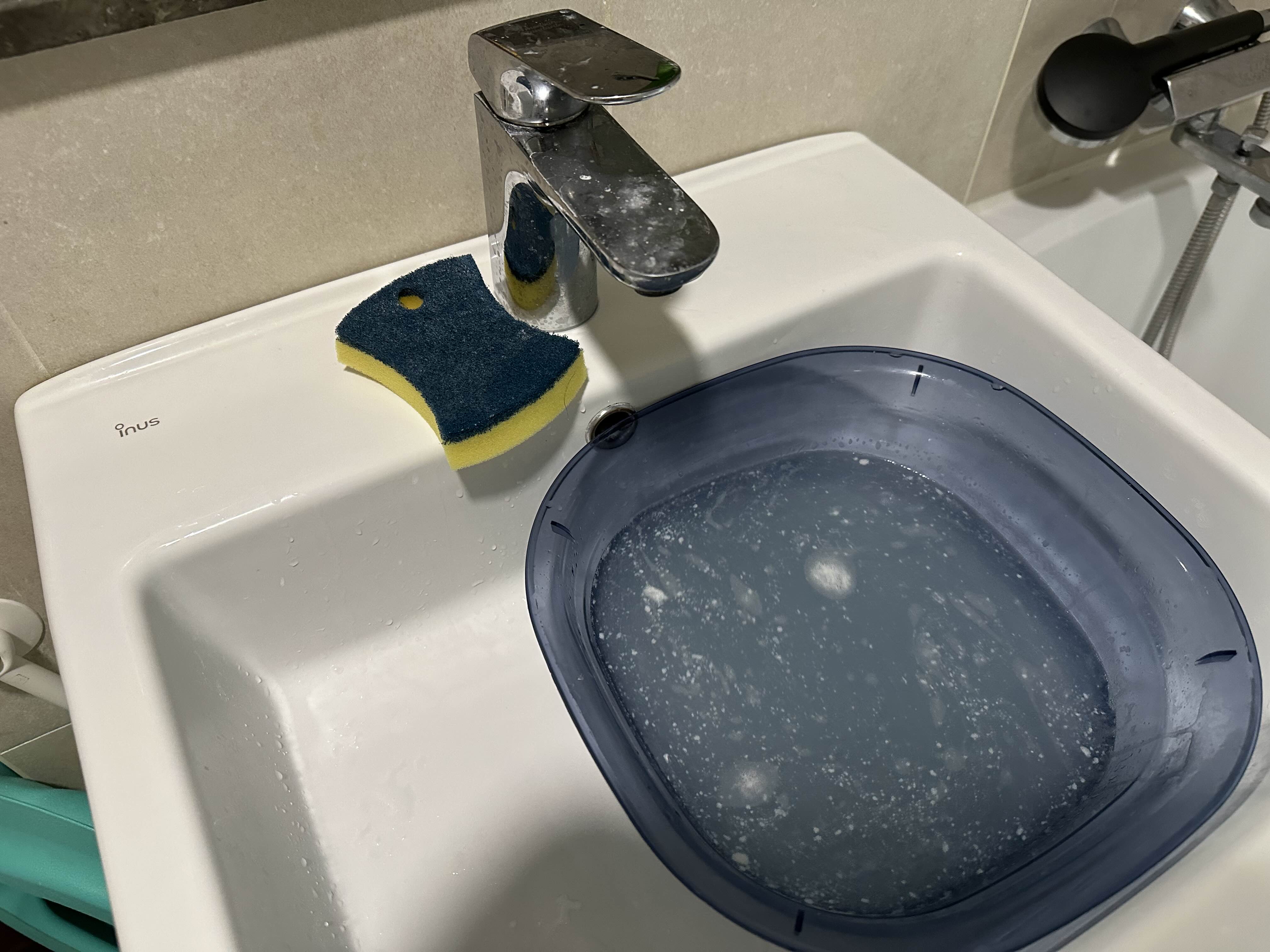 미지근한 물에 중성세제, 린스, 베이킹소다를 풀어서,