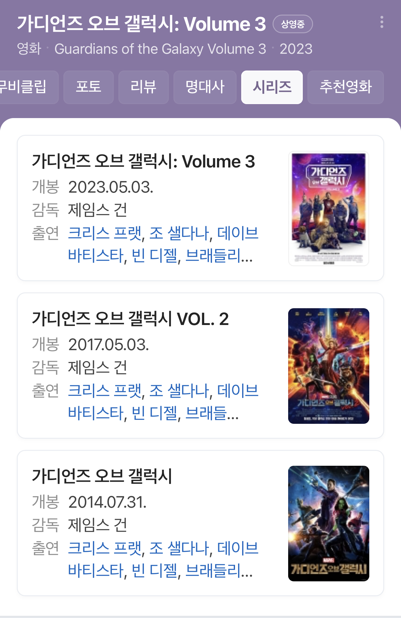 2023년 5월 3일 개봉하여, 마블 영화 시리즈로 인기를 구가 하고 있는 <가디언즈 오브 갤럭시3>는 어제까지만 해도 박스오피스 1위 였는데요. 오늘 검색해 보니 새로 개봉한 <분노의 질주-라이드 오어 다이>에 1위를 내주어서 현재 2위를 하고 있네요.