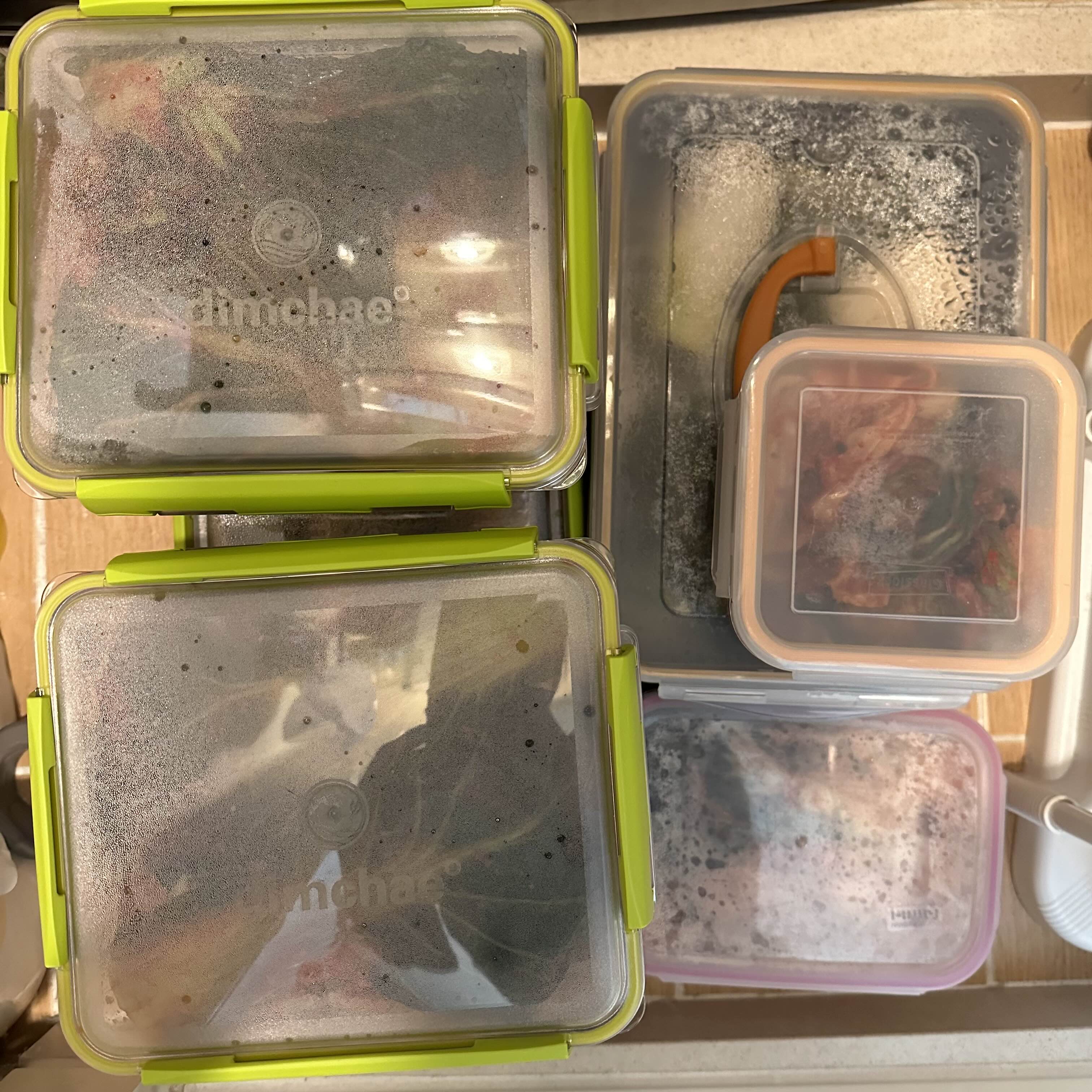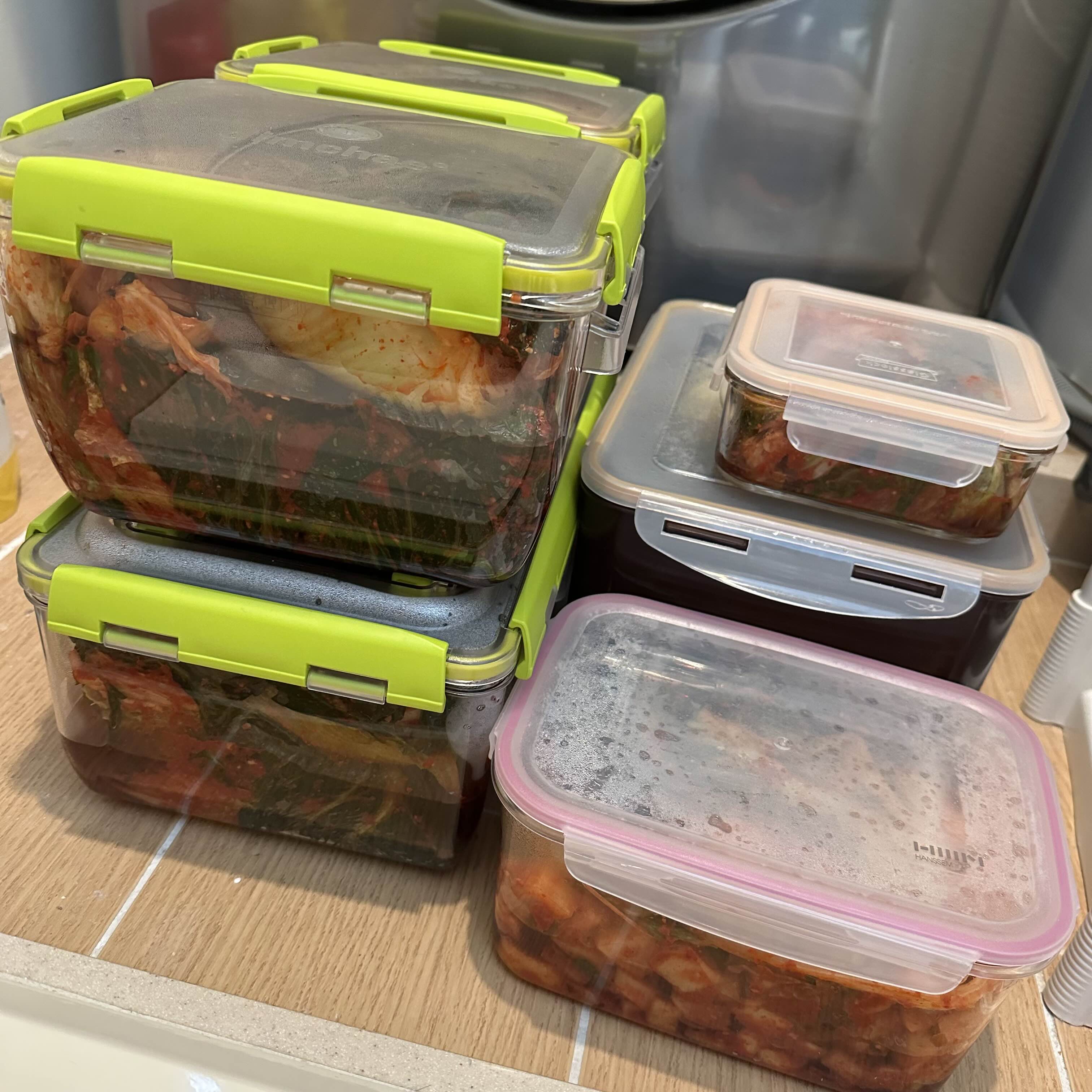둘째용 김치를 반찬통에 한통 가득 담고,