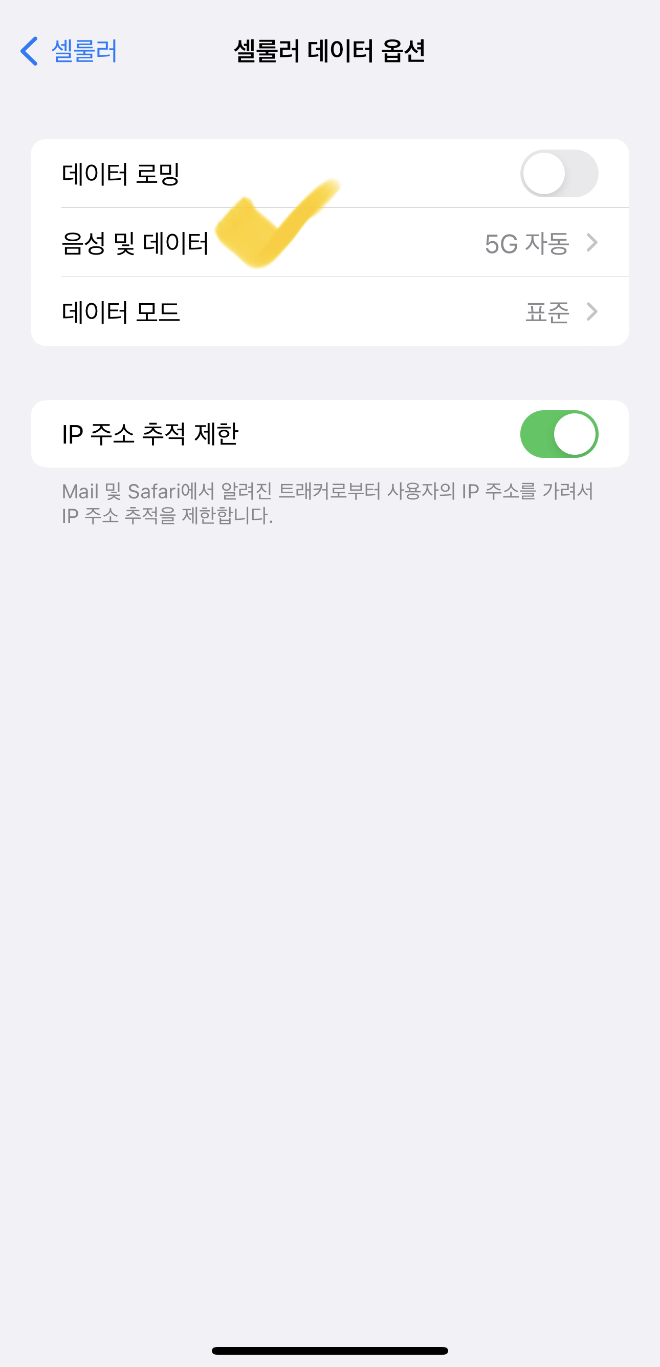 ➡️셀룰러 데이터 옵션➡️음성 및 데이터➡️LTE
