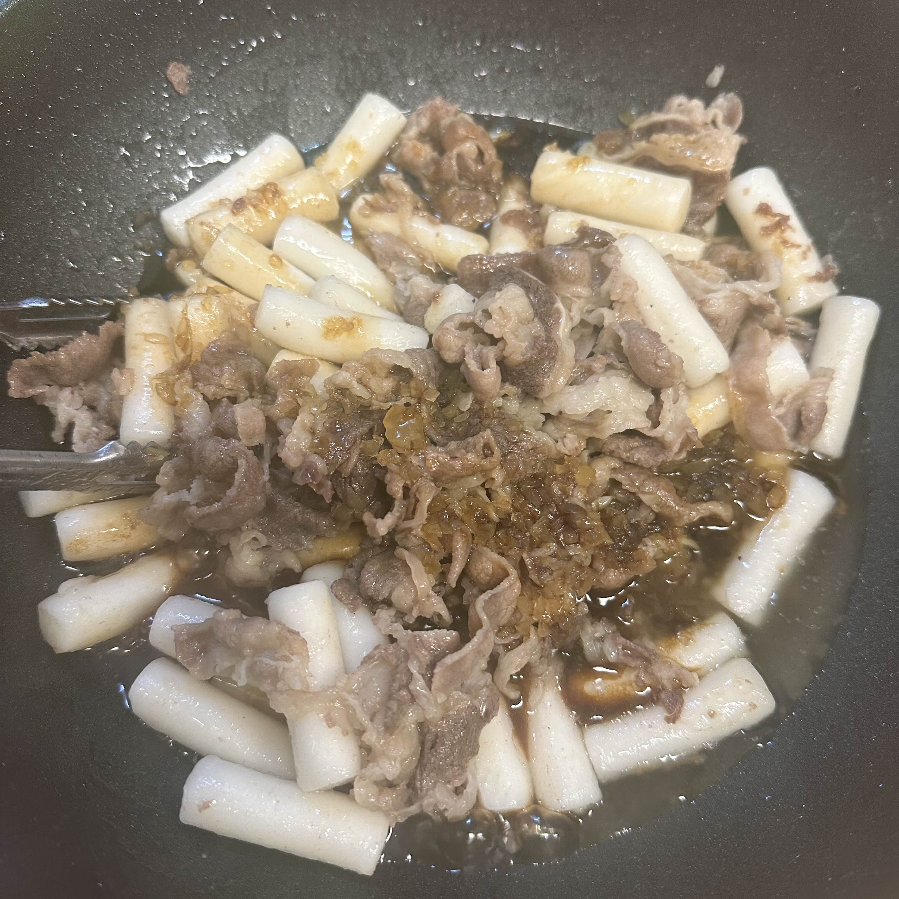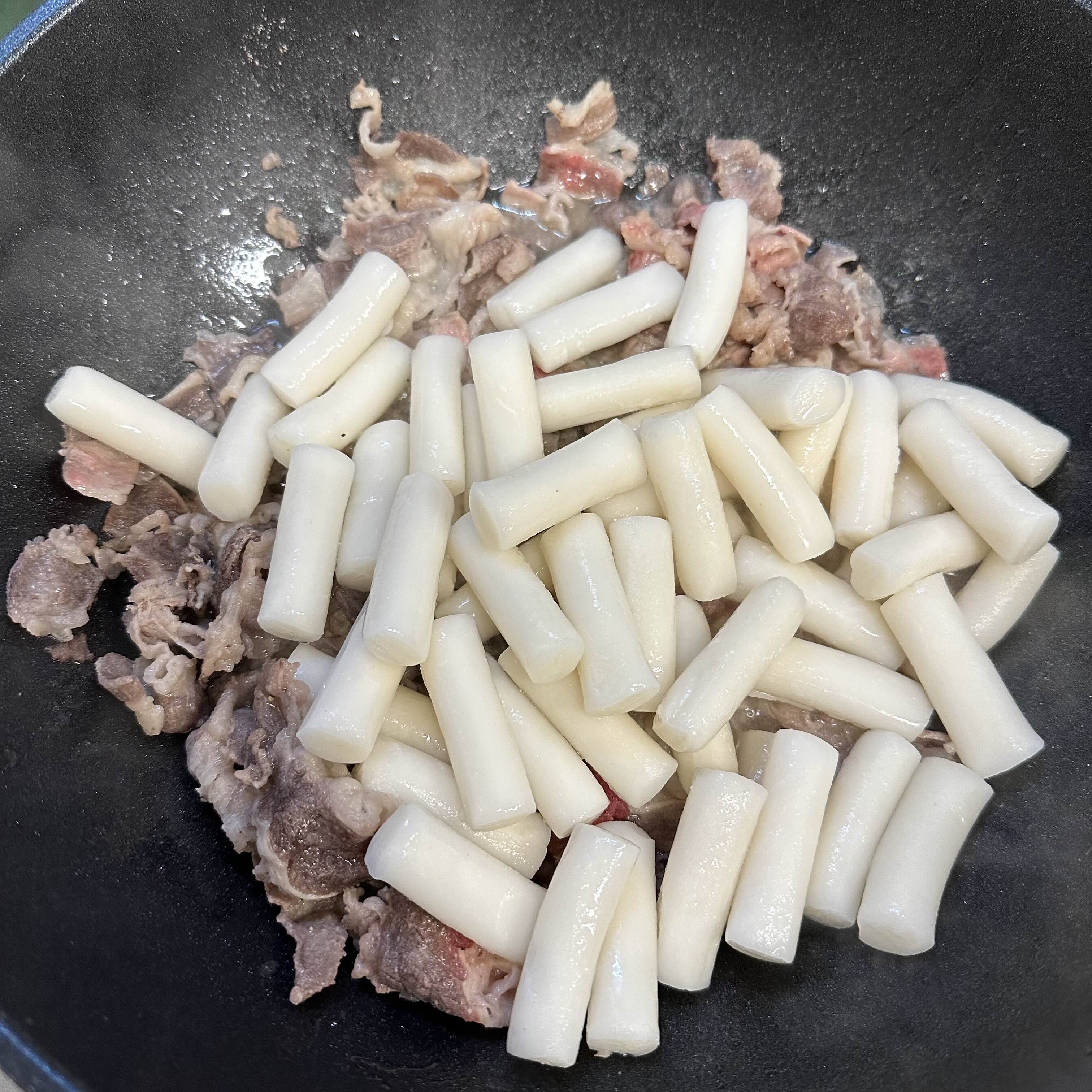 고기가 반이상 익었을 때, 완전히 익기전에 떡복이 떡을 넣어서 떡이 말랑해 질때까지 같이 볶아줘요.
