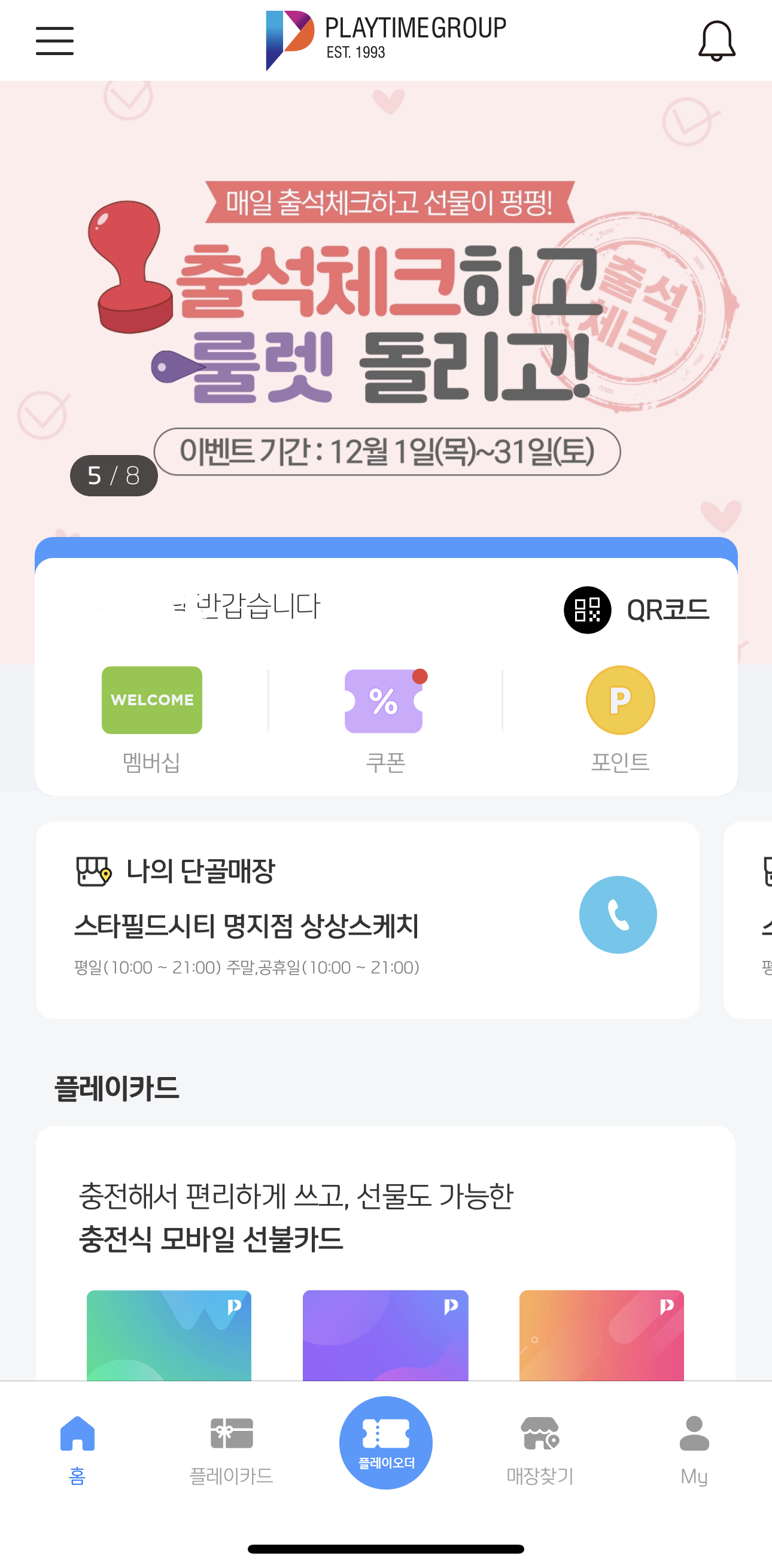 처음엔 첫 회원 가입하면 1회 이용권을 준다기에 깔아놓은 것이었어요. 그런데 주말처럼 붐빌 때 미리 예약해 놓고 갈 수도 있고, 아이 맡겨놓고 나면 데리러 가야 하는 시간도 확인할 수 있어 편리하더라고요. 게다가 출석체크를 하면 룰렛을 돌릴 수 있는 기회가 생기는데 하루 1번 기본 횟수와 합쳐서 하루에 2번 룰렛을 돌릴 수 있어요. 룰렛 돌리면 꽝도 나오긴 하지만 1천 원, 2천 원, 3천 원 할인쿠폰이 더 자주 나오더라고요. 쿠폰은 1인에 1개 쓸 수 있는데, 매일 해 놓고 쌓아 놓으니까 같이 가는 아이 친구까지 할인해서 입장했었어요^^