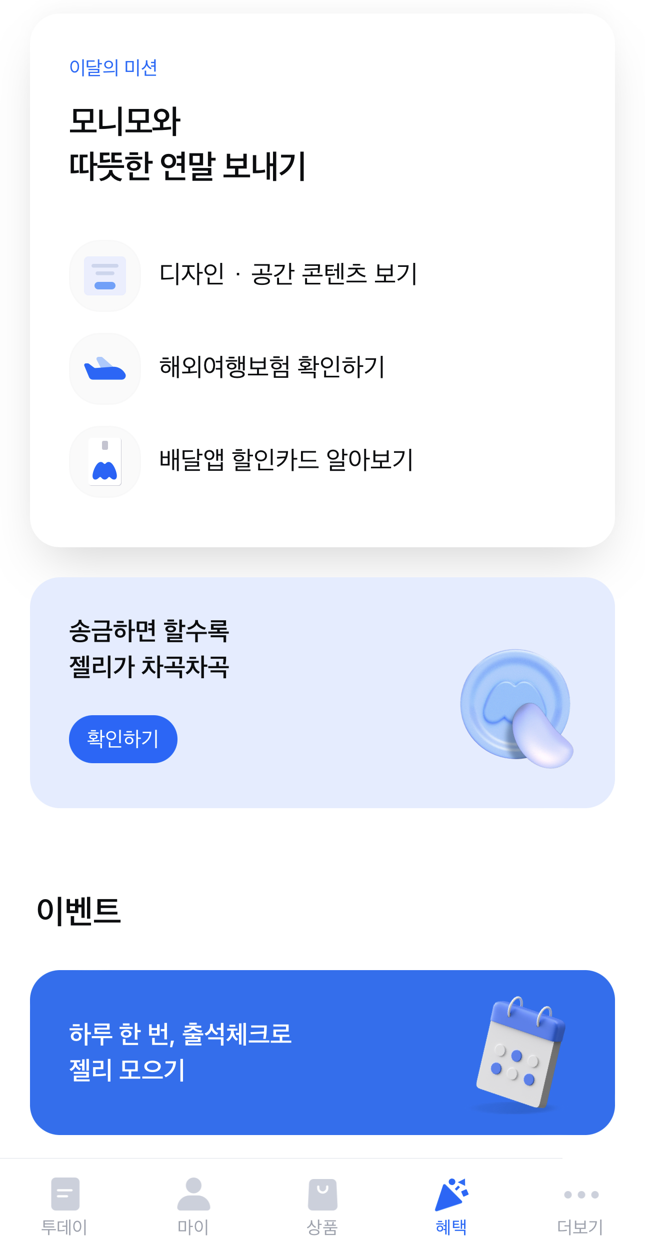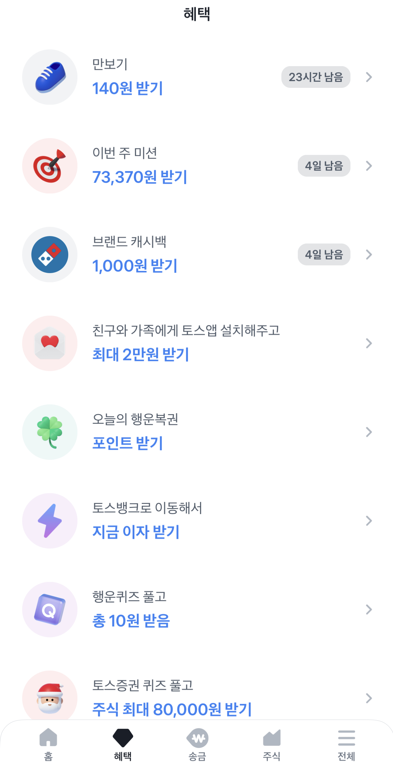 혜택 탭으로 들어가서 매일 확인하시면 되는데요. 만보기 미션해보실 수도 있고, 다양한 미션 수행하면 소액에서 큰 금액까지 받으실 수 있어요. 복권등도 매일 혜택 받으실 수 있고요. 심심할 때 수시로 들어가 보면 클릭으로 랜덤 금액도 받으실 수 있으니 나름 짭짤하답니다.