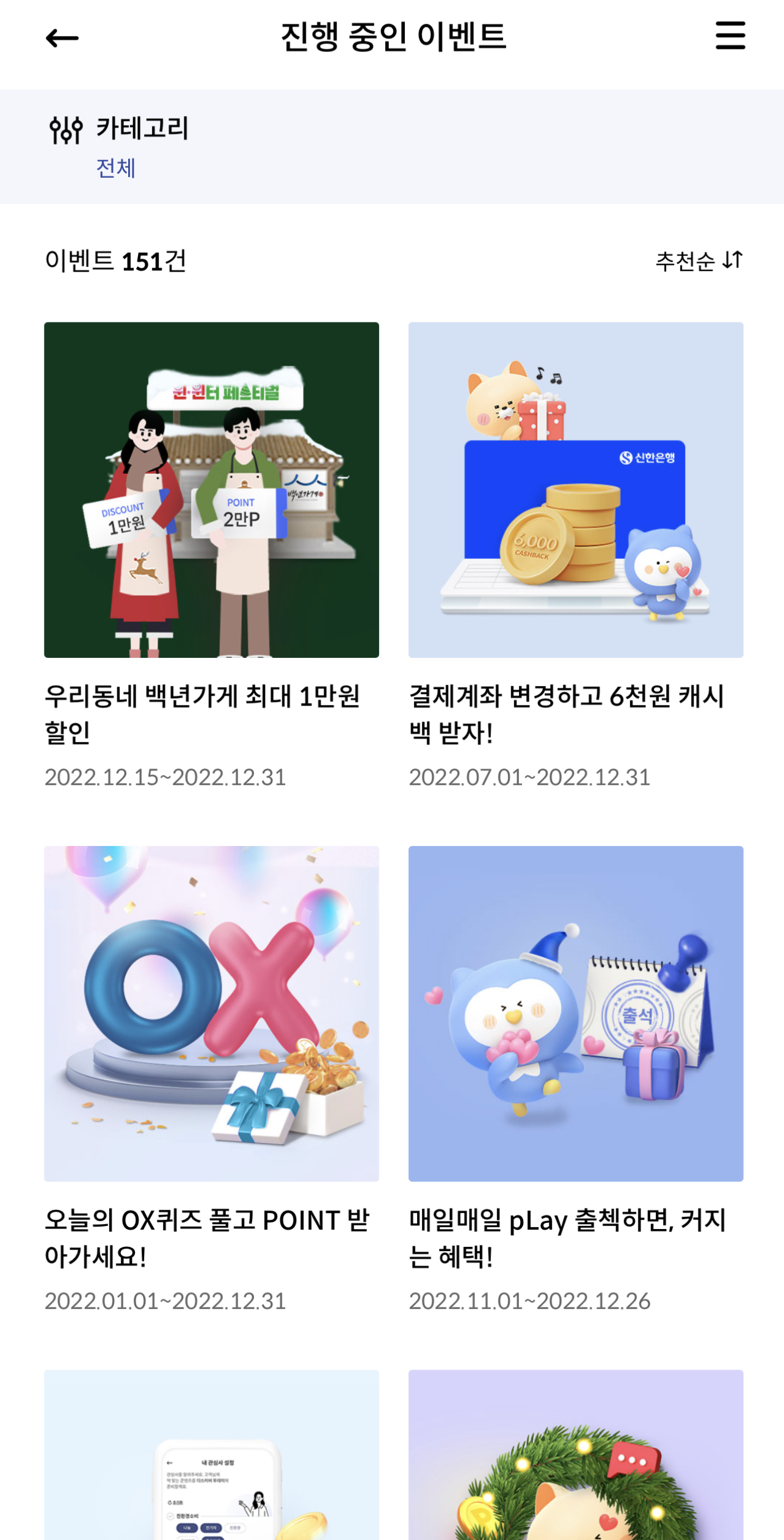 신한카드는 제가 거의 쓰지 않는 카드라서 이것저것 하지 않고 이벤트 탭에서 매일 OX퀴즈와 출석체크를 하고 있답니다.