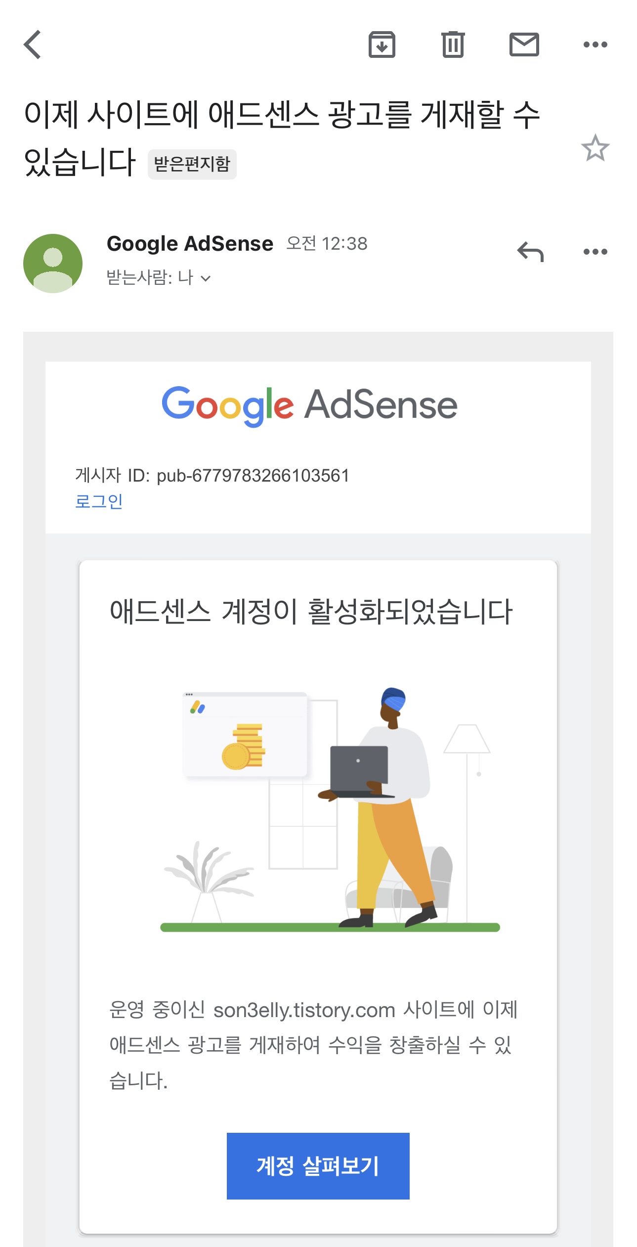 구글 애드센스에 내 블로그 계정이 활성화 되었다는 메일을 받으면 저 처럼 가만히 있으시면 안되구요.^^