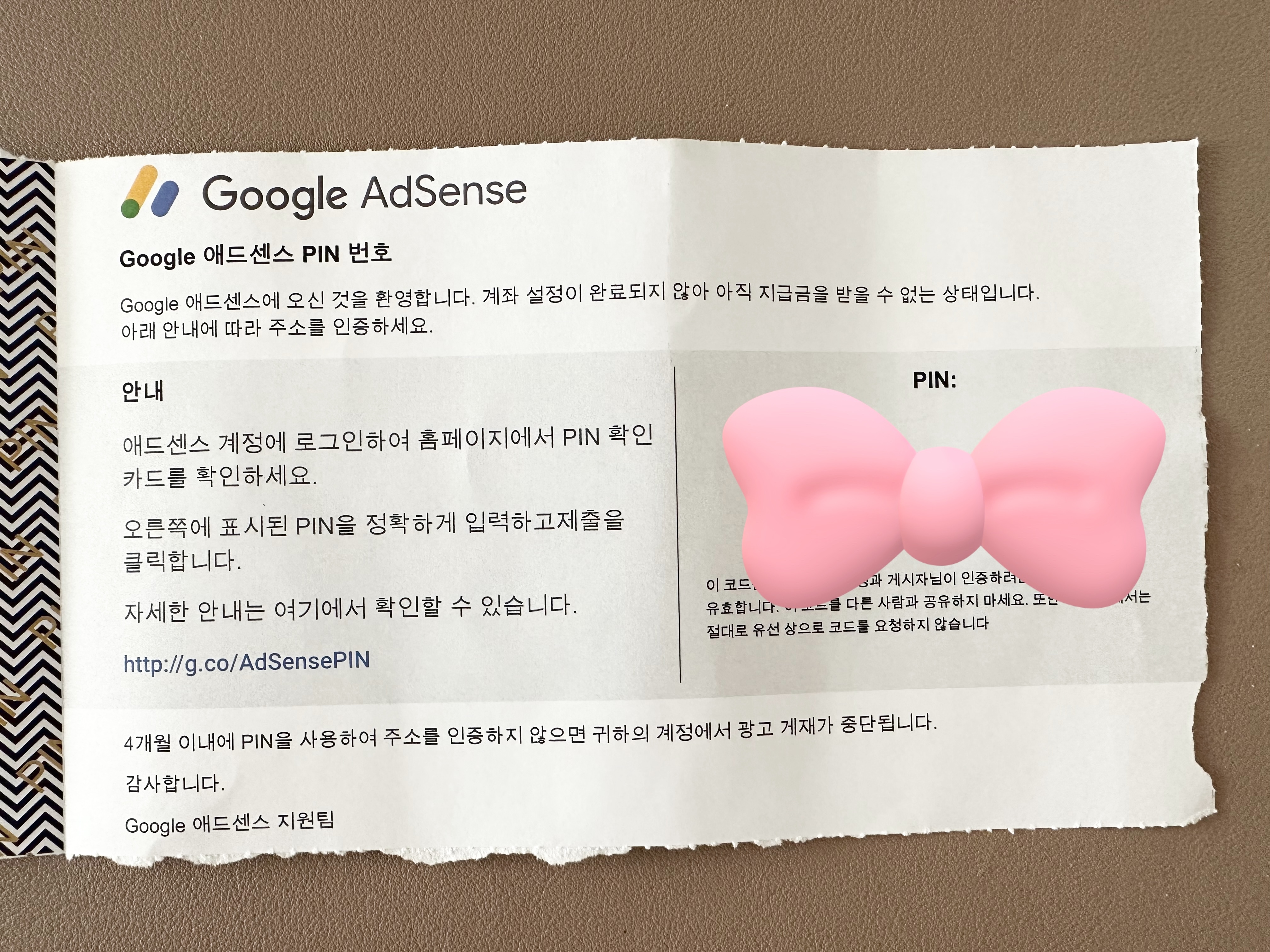 제가 저번에 구글 애드센스 신청하고 한번만에 등록이 되어서 기뻐했는데, 지급금을 받으려면 본인 주소로 오는 우편물의 PIN 번호를 입력해서 주소인증을 해야 하더라구요.