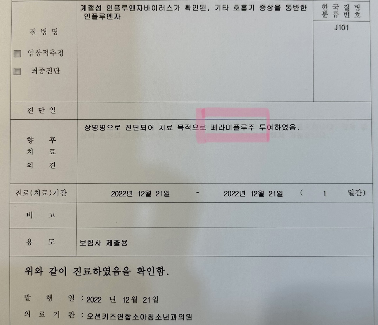 그리고 주사약인 페라미플루는 보험적용이 되지 않아 가격이 비쌉니다. 대신 개인적으로 실비 보험이 들어있으면 보험료 청구는 가능합니다. 또 주사약 투여 후 열이 떨어지면 24시간 이후에 일상생활 복귀가 가능해요. 어린이집, 유치원, 학교 등에 등교 가능 합니다.