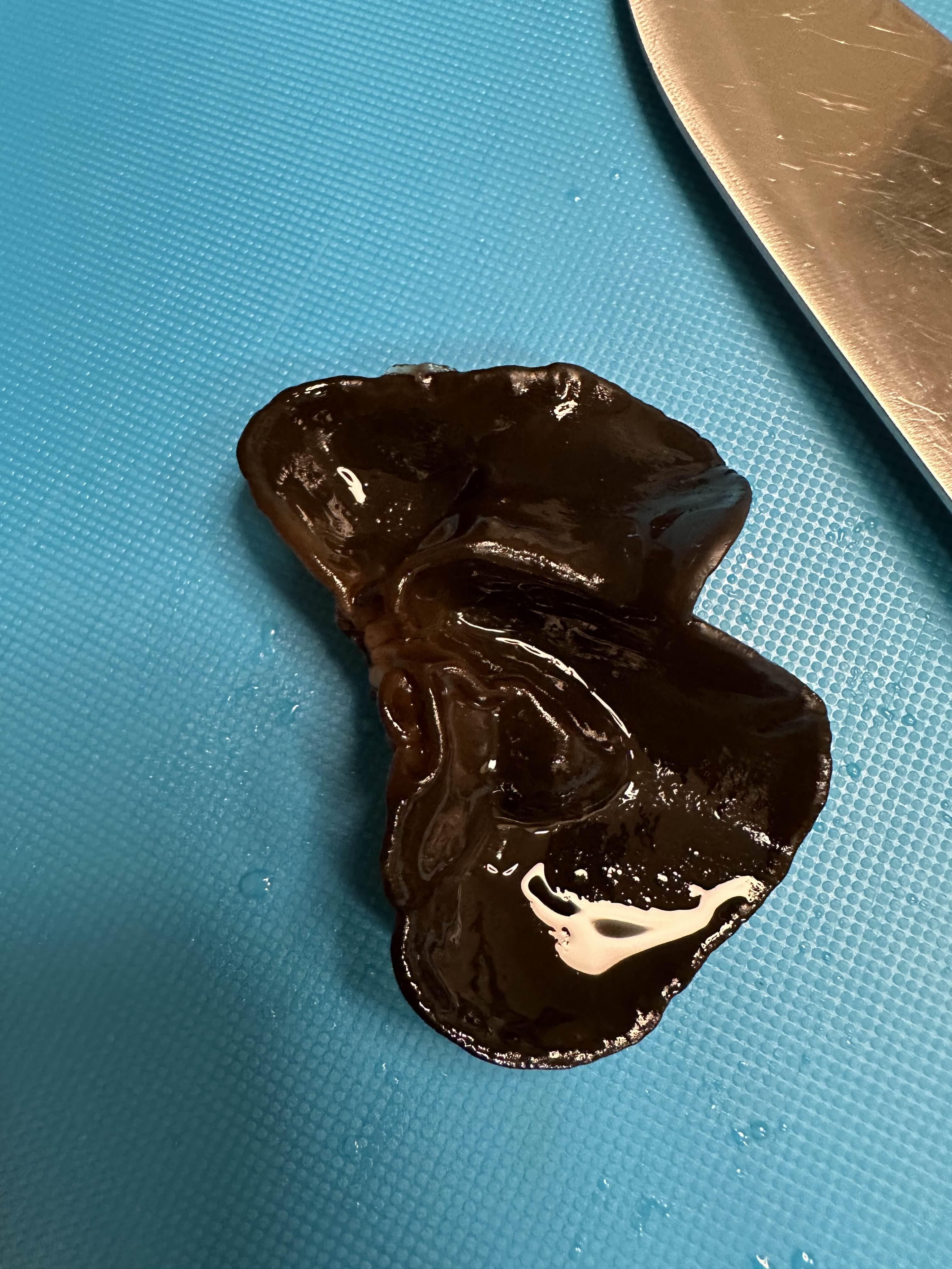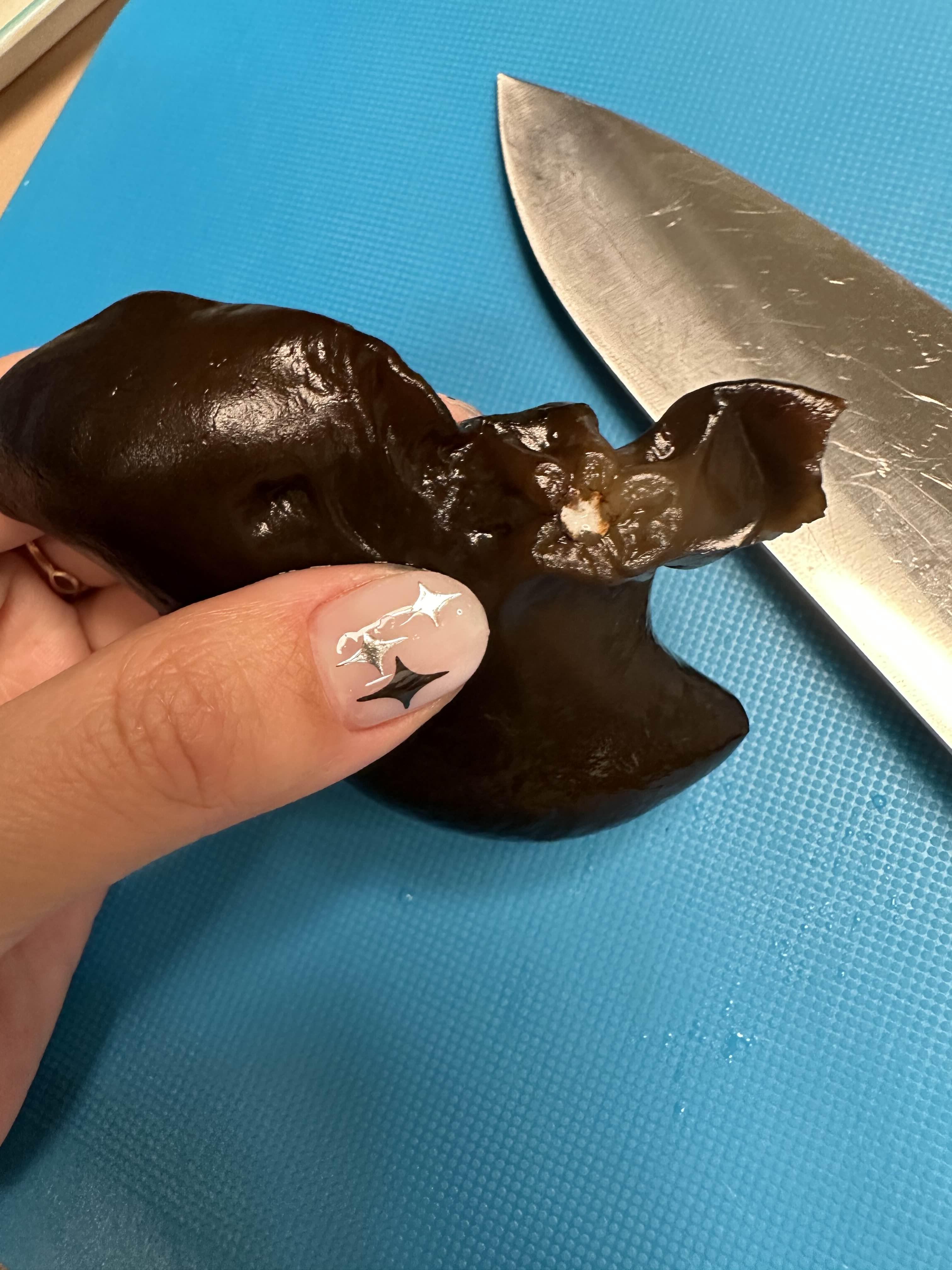 한번 씻어준 목이버섯, 또는 물에 불려놓은 목이버섯을 채에 받쳐 물기를 살짝 빼고, 버섯의 아랫부분에 있는 꼭지? 뿌리? 같은 부분을 잘라 내 주세요.
