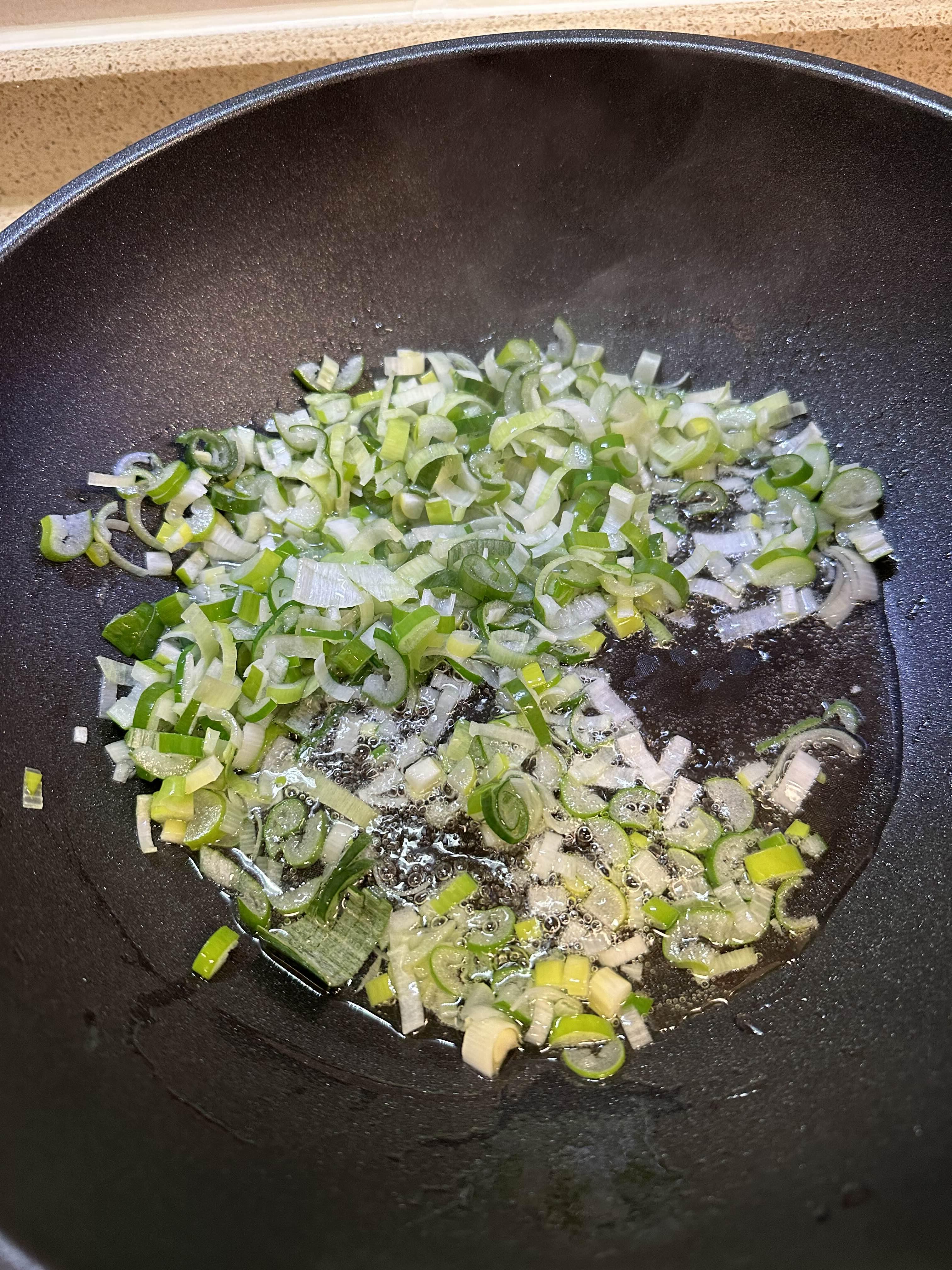 달군 후라이팬에 기름을 넉넉히 두르고 다진 파를 넣어서 파기름을 내 주세요. 파가 좀 익었다 싶을 때까지 파를 볶아주시면 됩니다. 이때 불은 중약불로 맞춰서 해주세요.