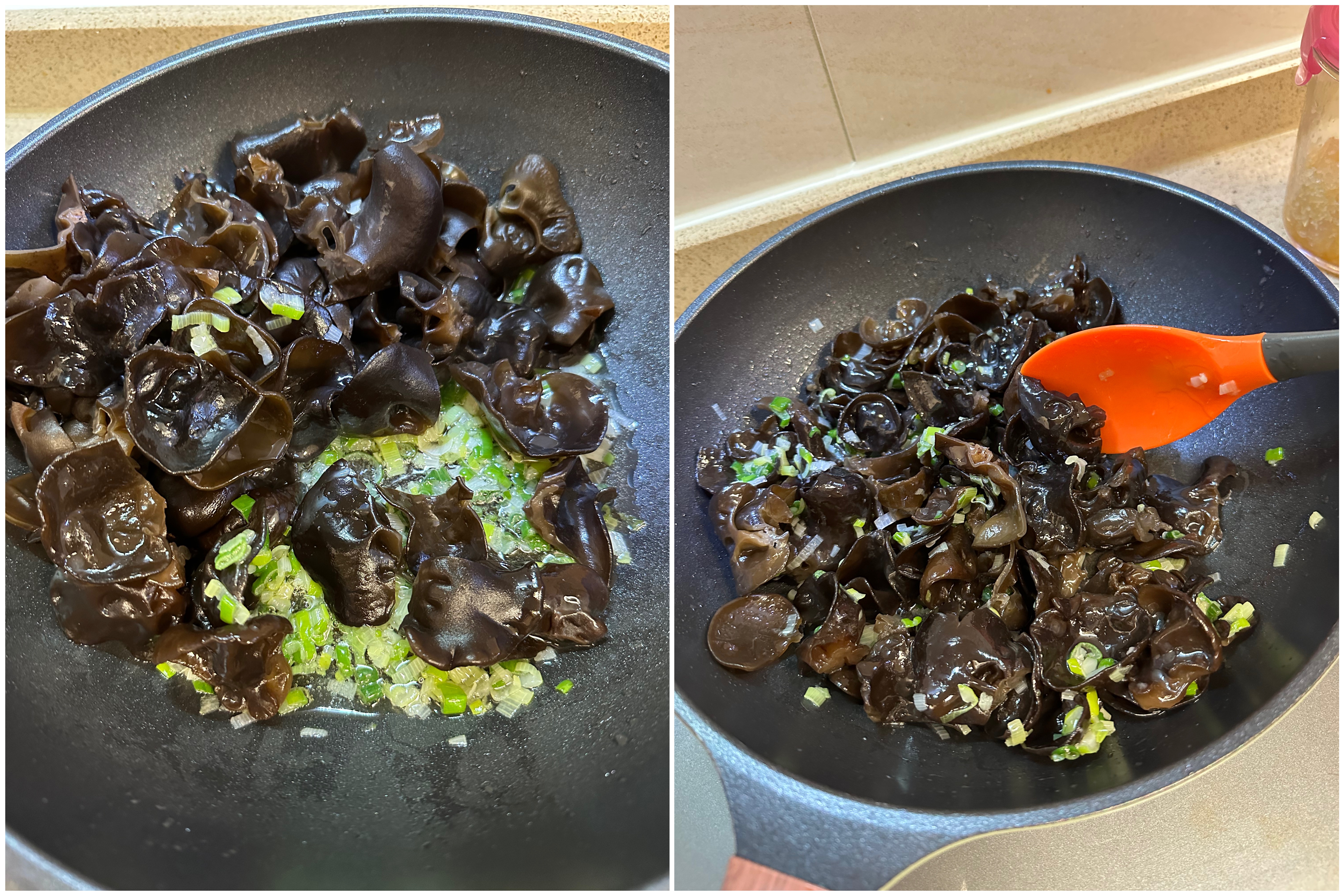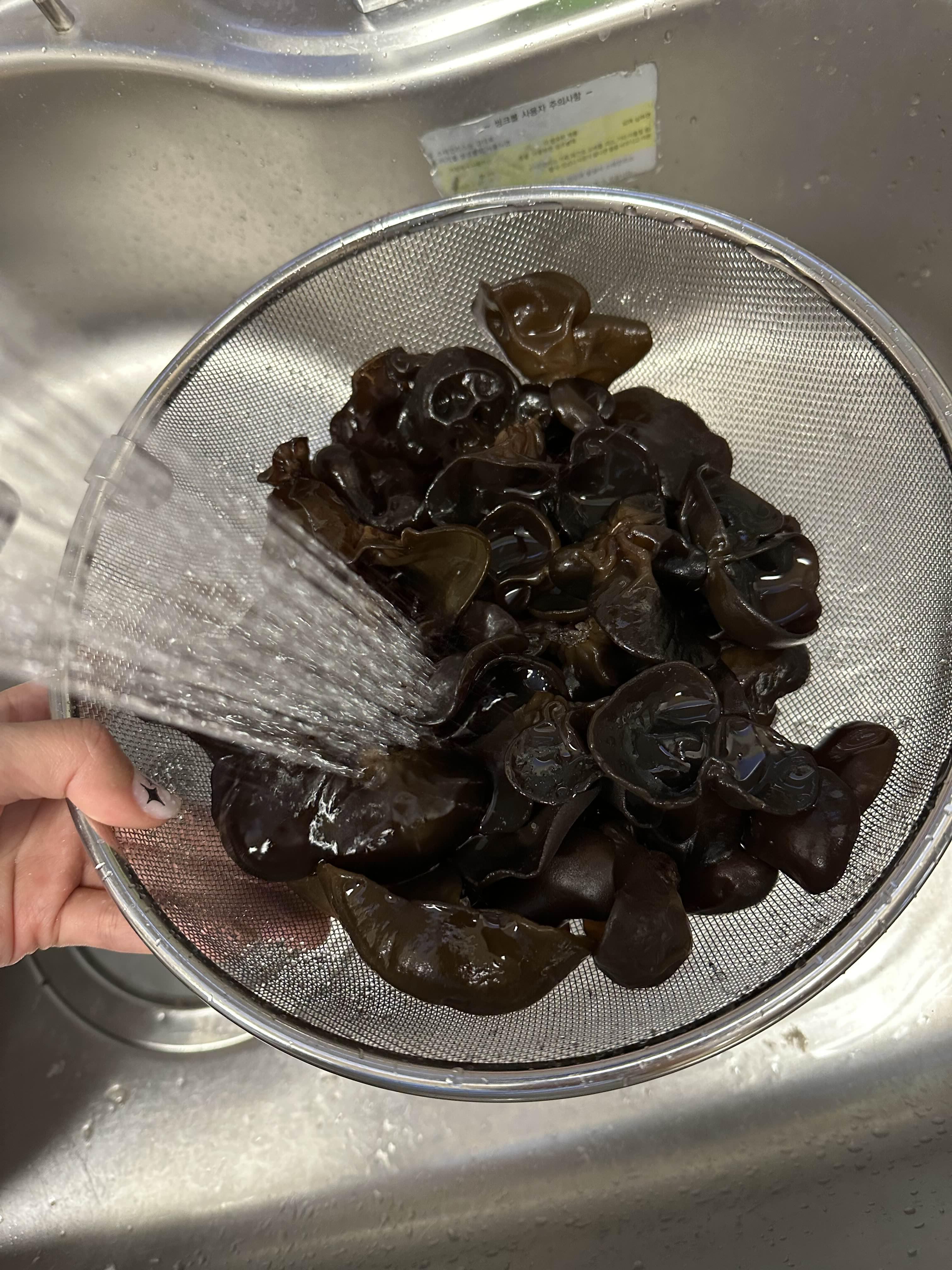 말린 목이버섯을 사용하시는 분은 먼저 물에 불려서 건져 주시고요, 생 목이버섯을 쓰시는 분은 흐르는 물에 한번 씻어주세요.