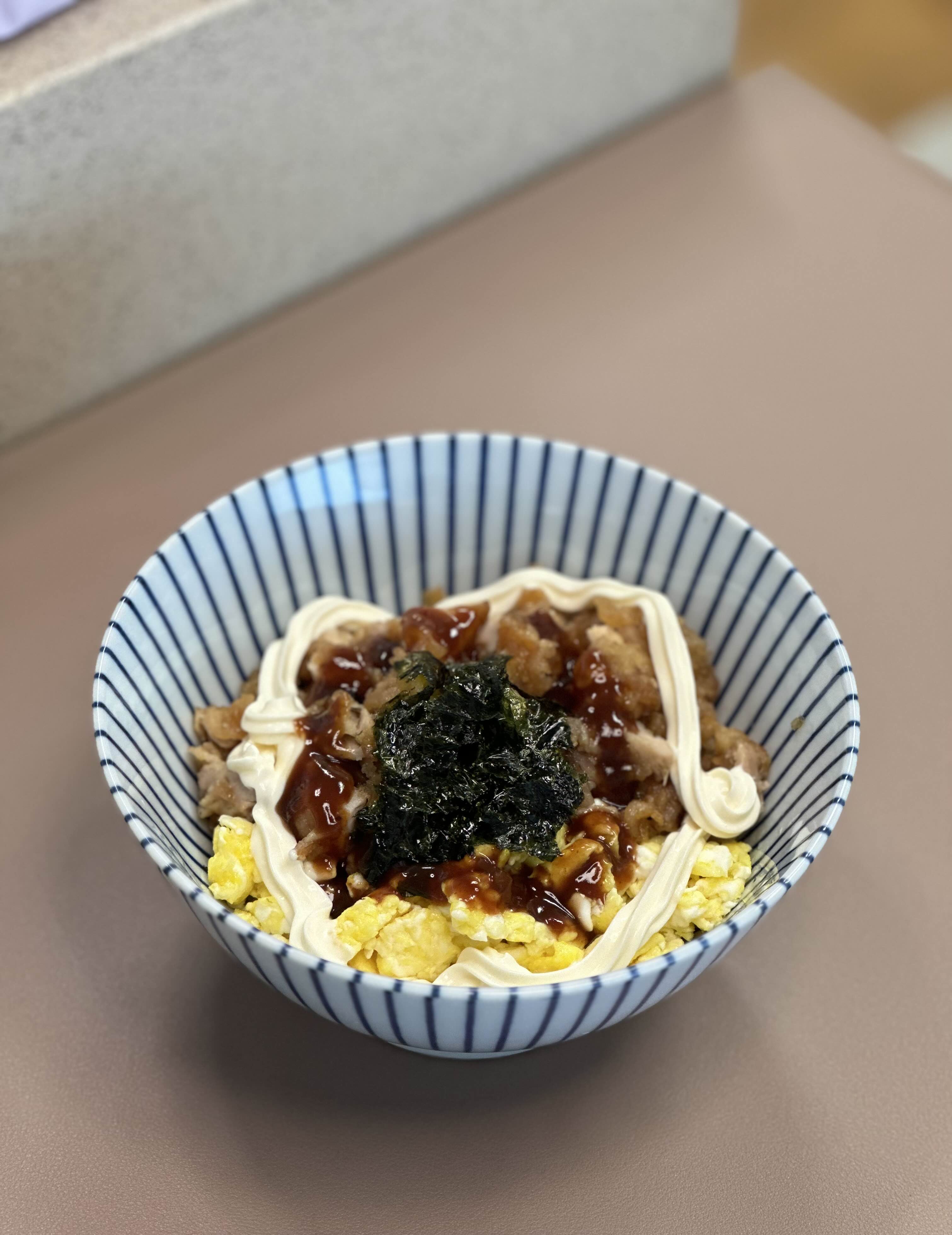 3. 그릇에 밥을 담고, 썰어놓은 치킨과 계란 스크램블을 담은 후, 조미김을 잘게 찟어 올리고, 마요네즈와 돈까스 소스를 한바퀴씩 뿌려주면 완성입니다.