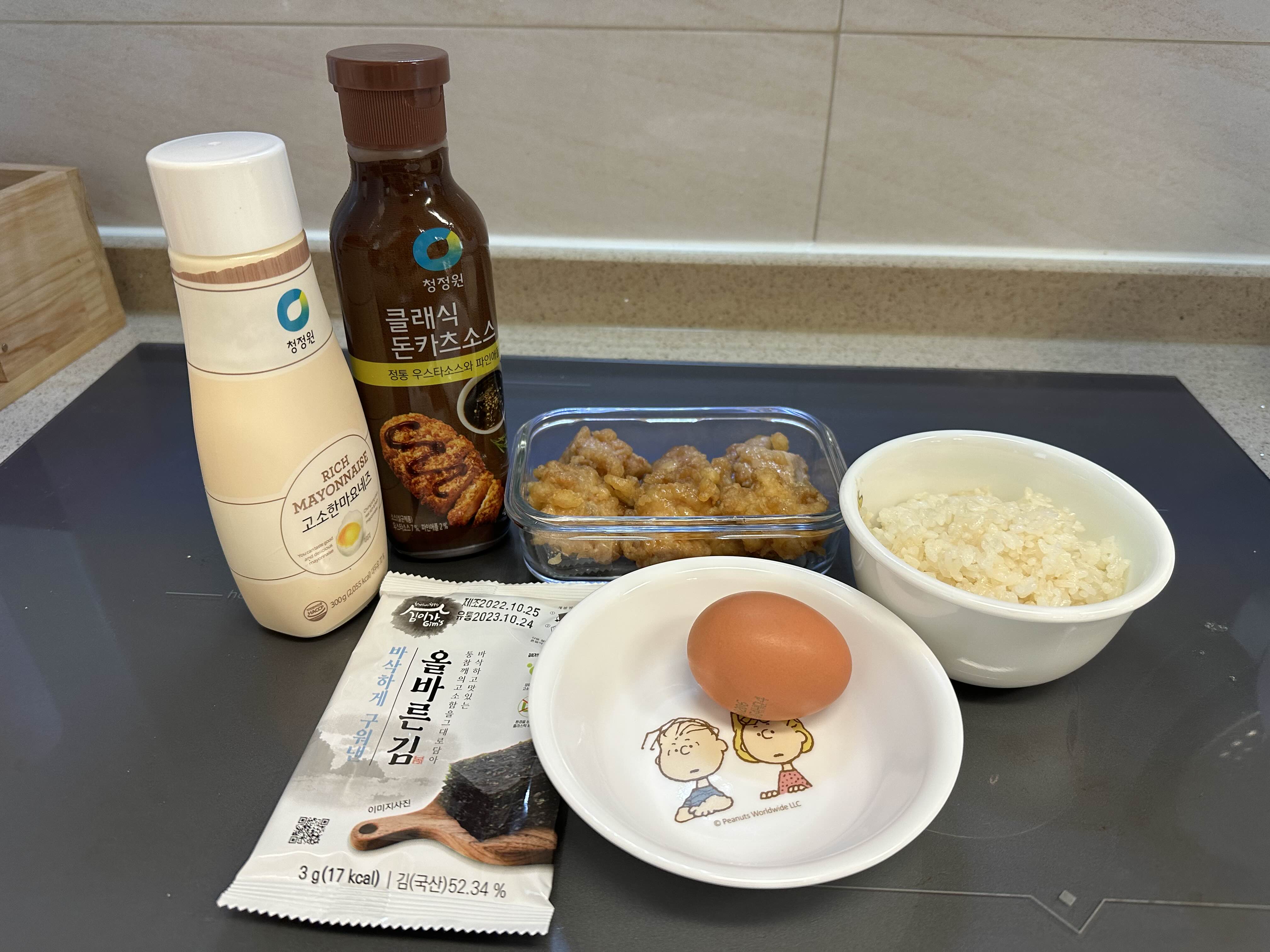 준비물 : 남은 치킨, 밥 한공기, 달걀1알, 조미김 조금, 돈까스 소스, 마요네즈