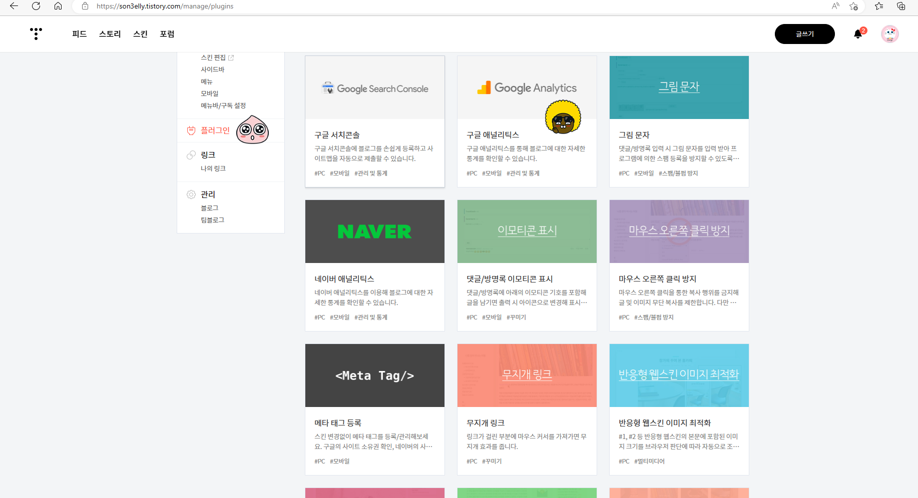 티스토리 설정 화면에서 아래로 내리면 '플러그인'이라고 되어 있는 곳이 있어요. 플러그인을 클릭해 주세요.