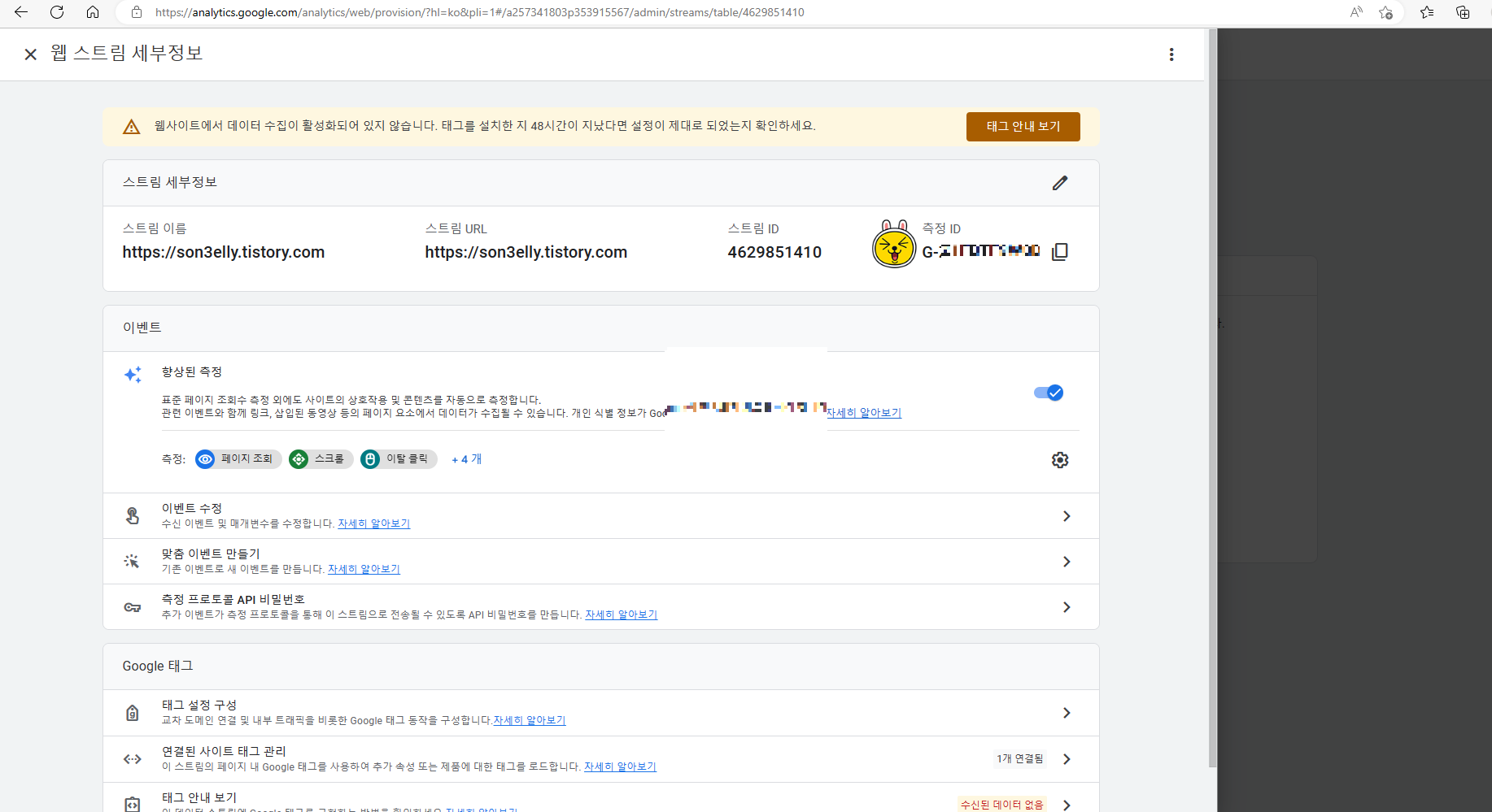 여기에 '측정 ID'라는 것이 있어요. 이것을 복사해서 내 티스토리에 붙여줘야 합니다.