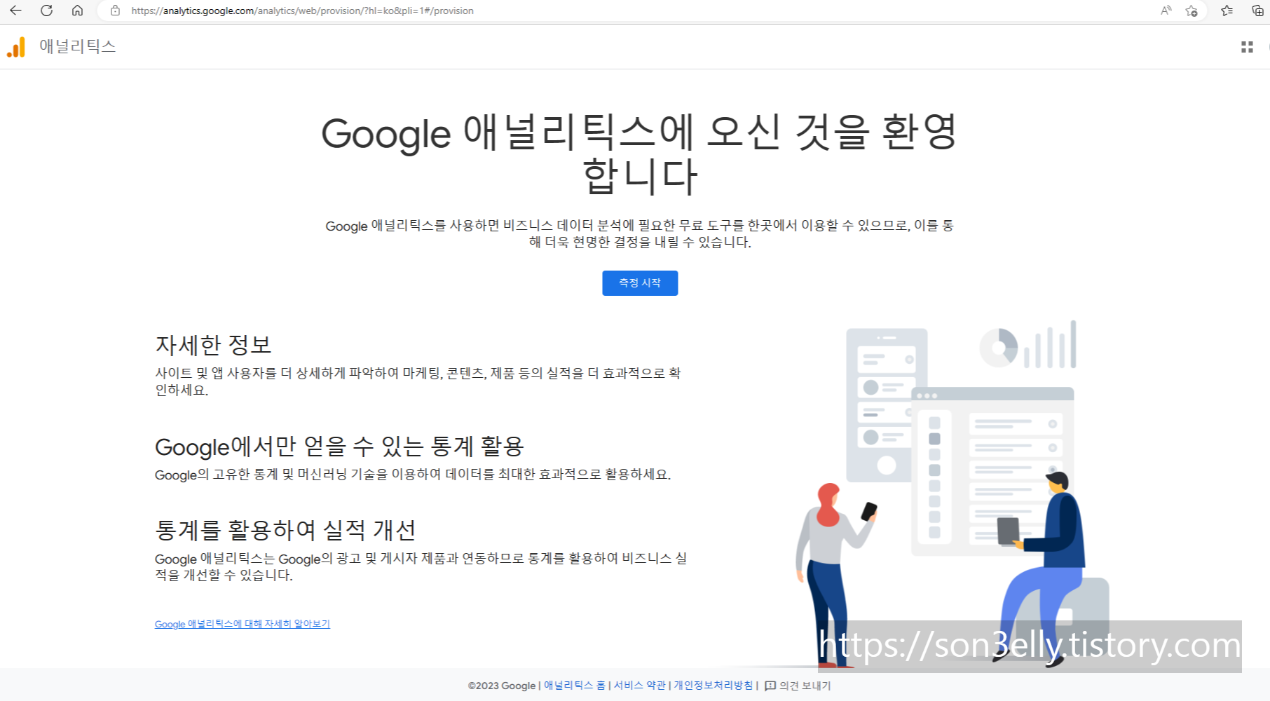 먼저 구글 애널리틱스 사이트에 들어가서, 이 화면에서 파란색 '측정시작'을 클릭해 주세요.