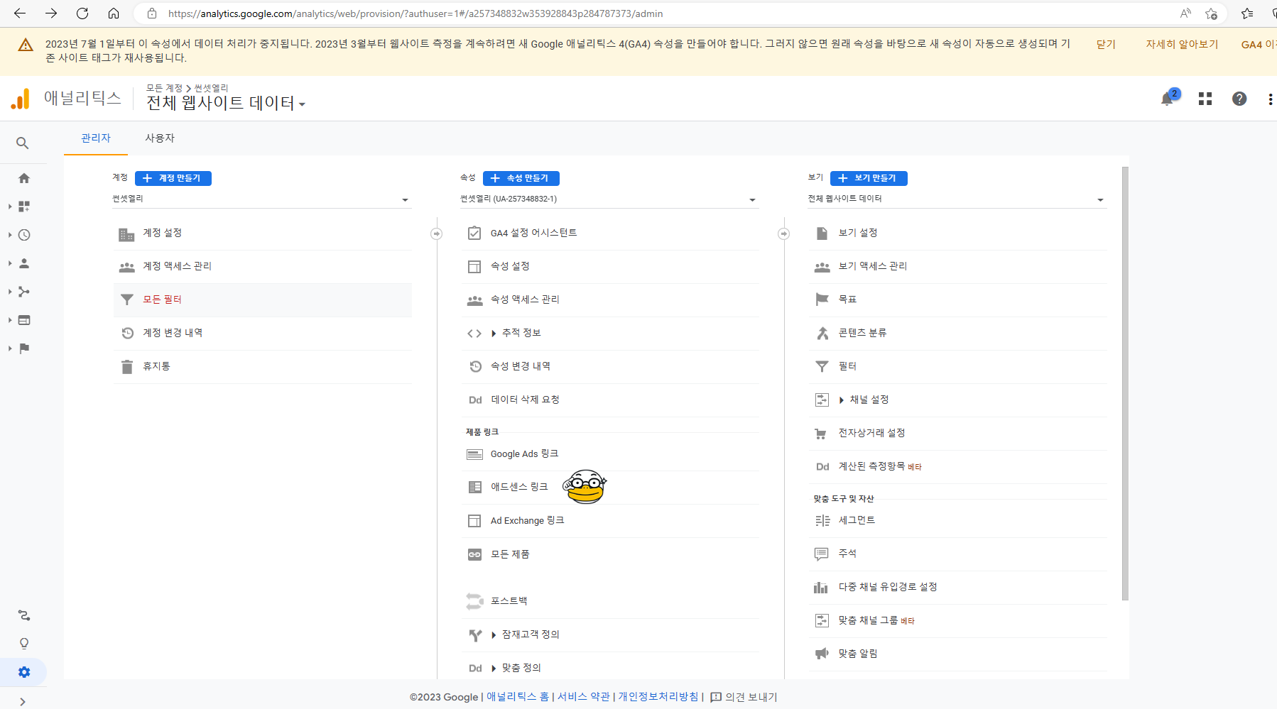 애널리틱스 화면으로 돌아가서 왼쪽 아래 톱니바퀴 모양의 관리 버튼을 눌러주세요.