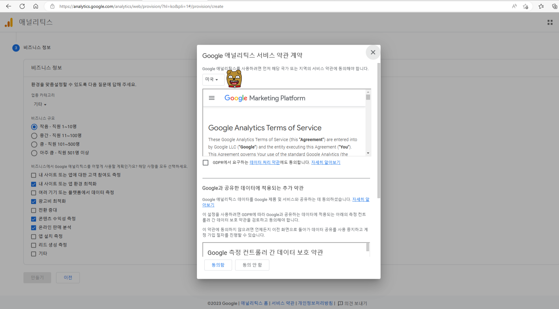 '비지니스에서 구글 애널리틱스를 어떻게 사용할 계획' 인지에 대해서는 본인이 원하는 해당사항을 모두 클릭해 주시면 되세요. 저는 '내 사이트 또는 앱 환경 최적화', ' 광고비 최적화', '콘텐츠 수익성 측정', '온라인 판매 분석' 을 클릭했습니다.
